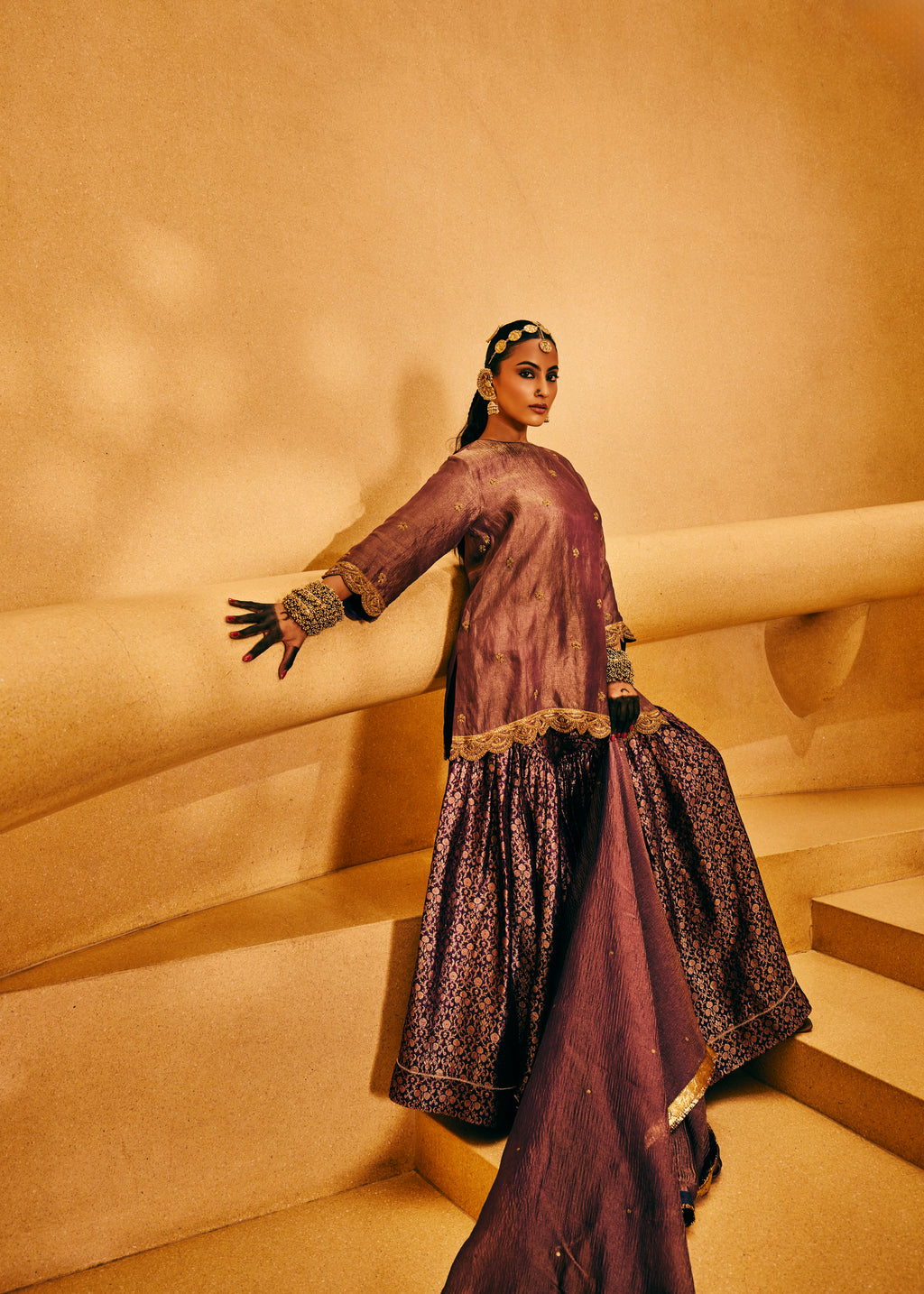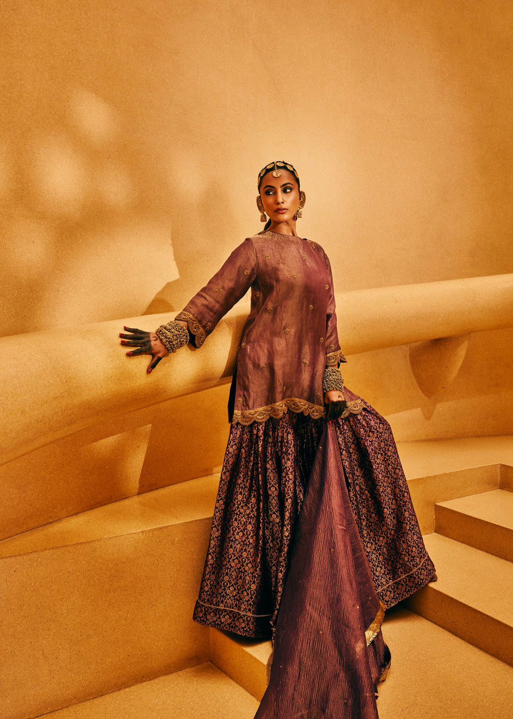 CRUSHED TISSUE TUNIC WITH BROCADE SHARARA- PURPLE